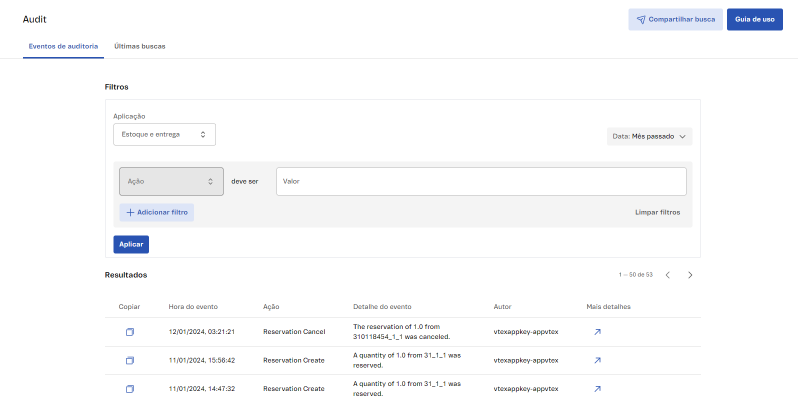 O Audit possibilita realizar buscas por eventos a partir de filtros relacionados às informações a seguir: aplicação, data, ação, autor e detalhes do evento. A seguir, explicamos como utilizar os filtros do Audit e como os resultados são apresentados. Também demonstramos o uso de filtros com exemplos práticos.
