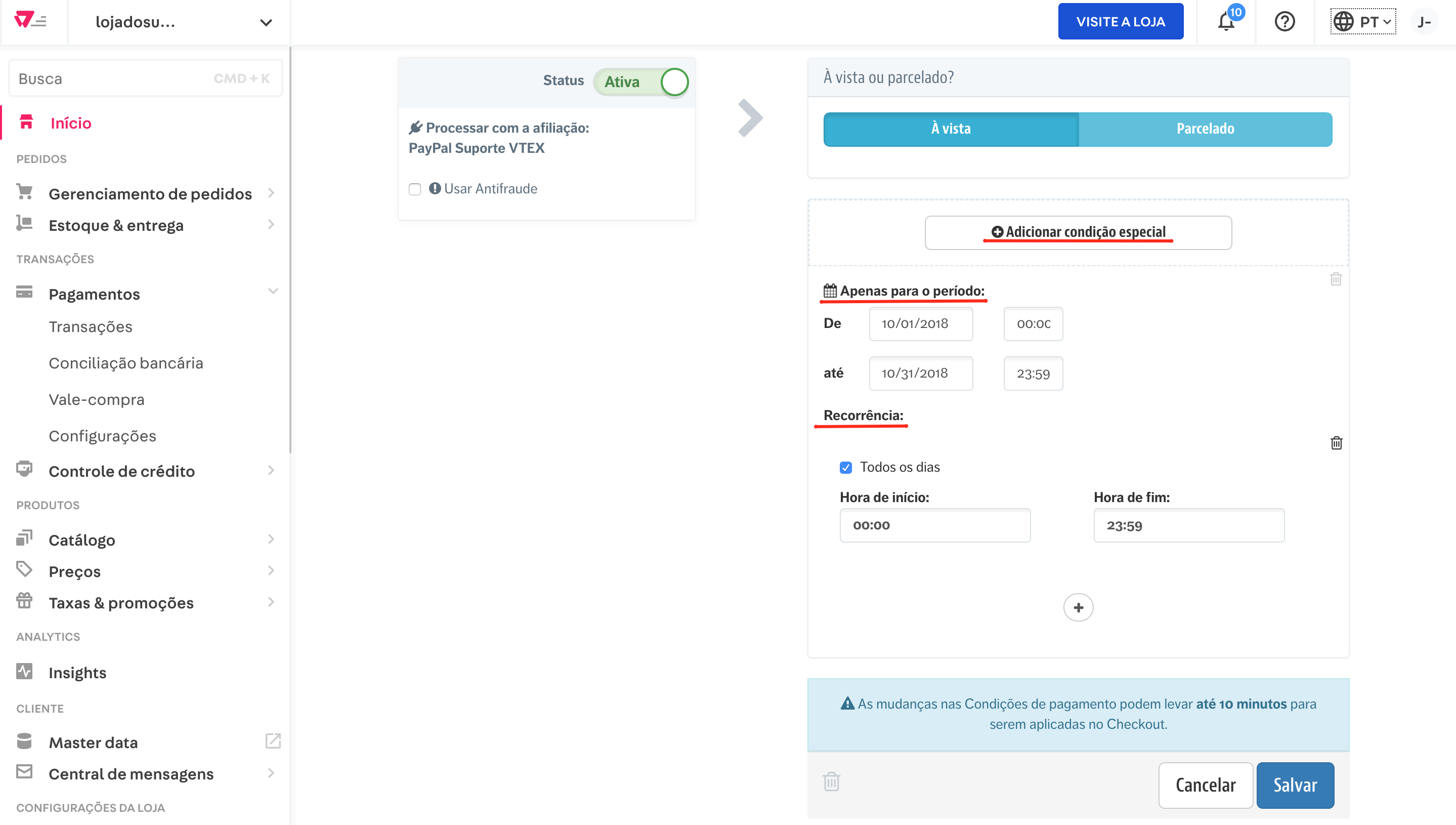 Permite configurar uma validade na condição de pagamento, para que deixe de ser aplicada na sua loja quando a data expirar.
