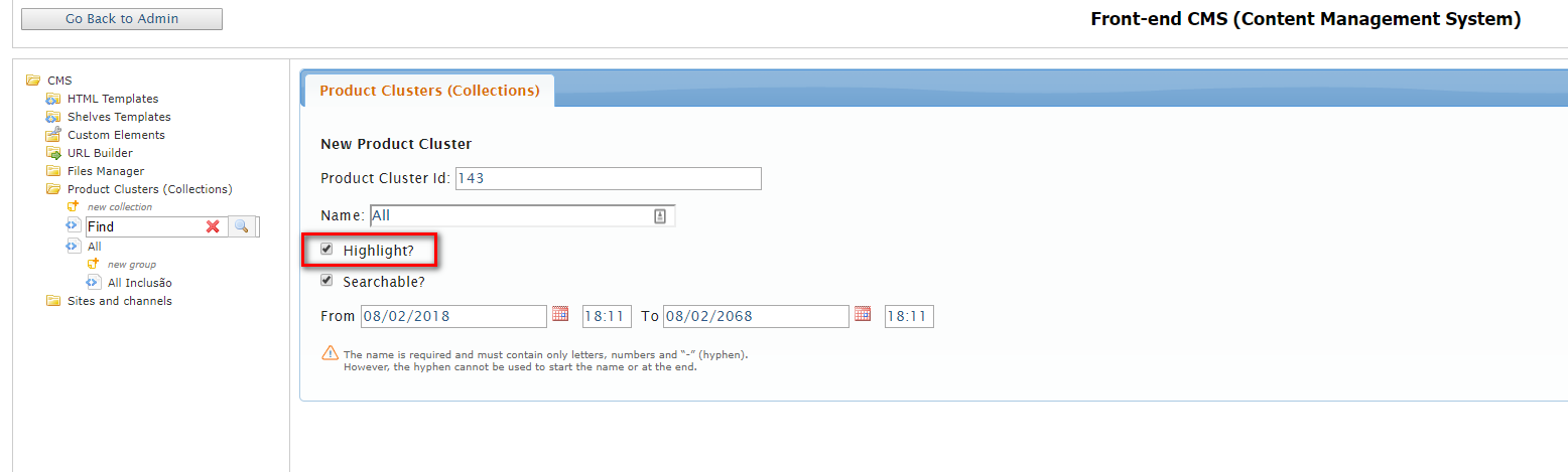 - Marque a flag Highlight, que fica na tela da coleção, e clique em Save Product Cluster.