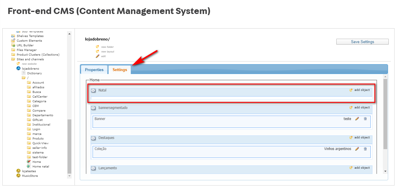 - Abra o layout e depois clique na aba Settings. O novo placeholder deve aparecer aí, com o nome igual ao valor do id definido no controle. Por enquanto, esse placeholder está vazio, ou seja, não há nenhum objeto dentro dele.