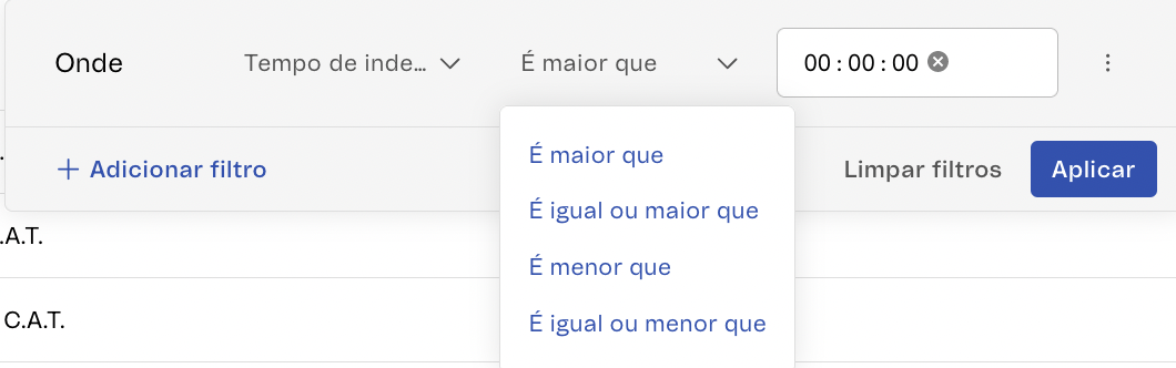 Caso filtre por Tempo de indexação você pode selecionar se o intervelo de tempo É maior que, É igual ou maior que, É menor que ou É igual ou menor que um horário definido.
