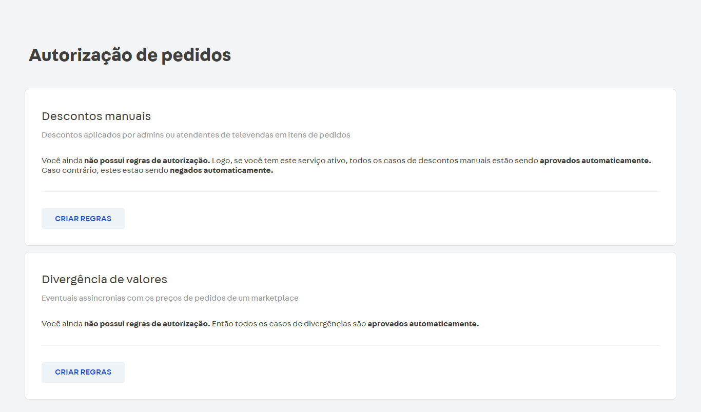 No Admin VTEX, em Configurações da loja > Pedidos > Autorização de pedidos, é possível controlar a aprovação de pedidos com divergência de preços na sua loja.