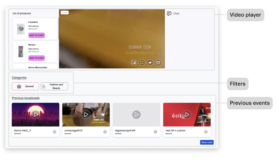 - Reprodutor de mídia ao vivo: reprodutor de mídia selecionado para determinada transmissão ao vivo, incluindo a lista de produtos em destaque e o chat.