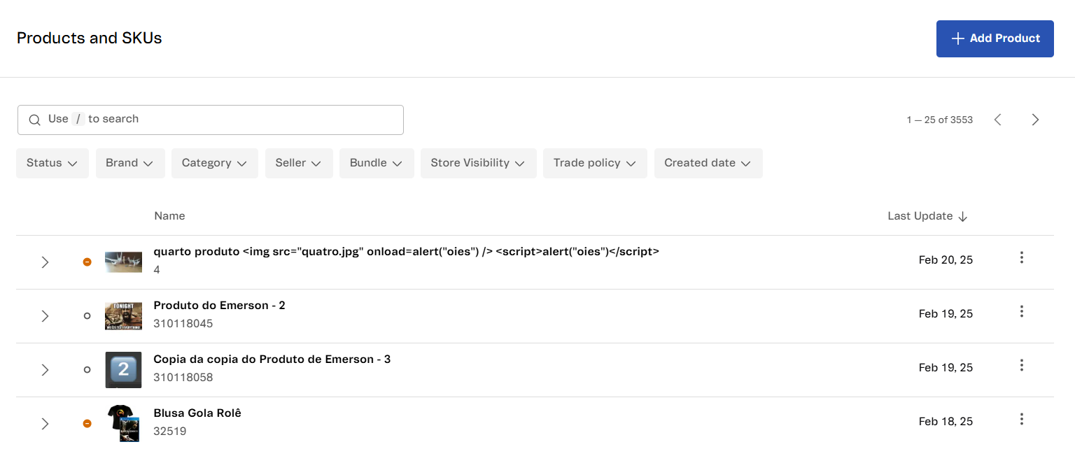| Name | The product name, set when adding it. Below the name, the page displays the product ID, which is the product's unique identifier code.Next to the name, each row displays an arrow to view the list of SKUs associated with the product, an icon that represents product availability and the product image. |