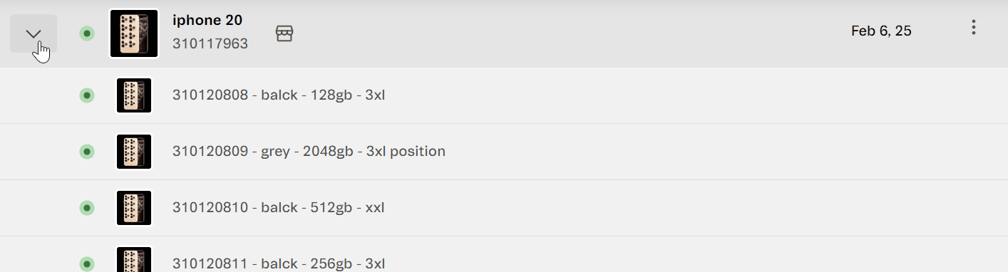 When you click the arrow in the product row, the platform displays a list with all the SKUs of that product, as shown in the image below: