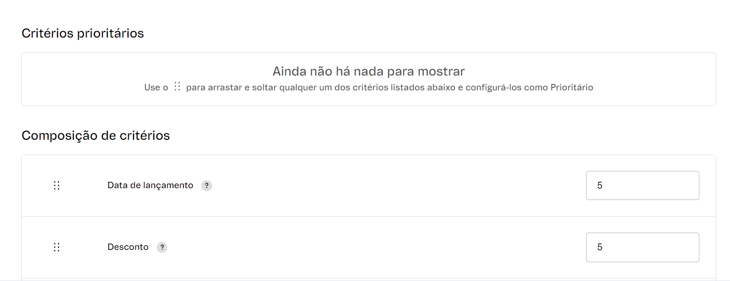 - Critérios prioritários: é a forma de forçar que um ou mais critérios terão prioridade maior entre os demais. Nessa situação não existem pesos, pois todos os produtos que possuírem essa característica serão apresentados primeiro no resultado de busca.