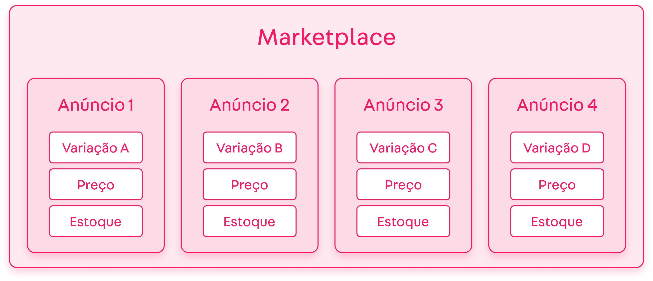 Na ilustração podemos ver uma série de anúncios de um seller na vitrine de um marketplace, contendo as variações de seus produtos.