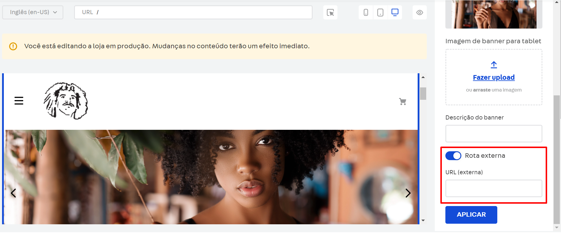 Você pode configurar um dos banners de sua loja para um redirecionamento de página, ou seja, levar os usuários a qualquer página de sua escolha. Para configurar isso usando o Site Editor, vincule o banner a qualquer URL interna ou externa seguindo as etapas abaixo.