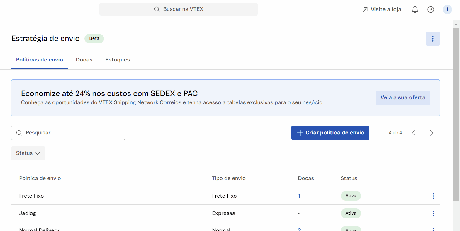 Essa funcionalidade está em fase Beta, o que significa que estamos trabalhando para aprimorá-la. Caso tenha interesse em adotar essa funcionalidade no seu negócio, acesse o site VTEX Shipping Network Correios. Em caso de dúvidas, entre em contato pelo email vtexlog@vtex.com.br.