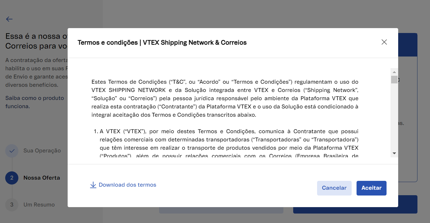 Aceitarpara concordar com as condições apresentadas e ativar o VTEX Shipping Network Correios. - Na etapa Um Resumo, confira as informações finais e garanta que a sua operação tenha uma agência dos Correios parceira.
